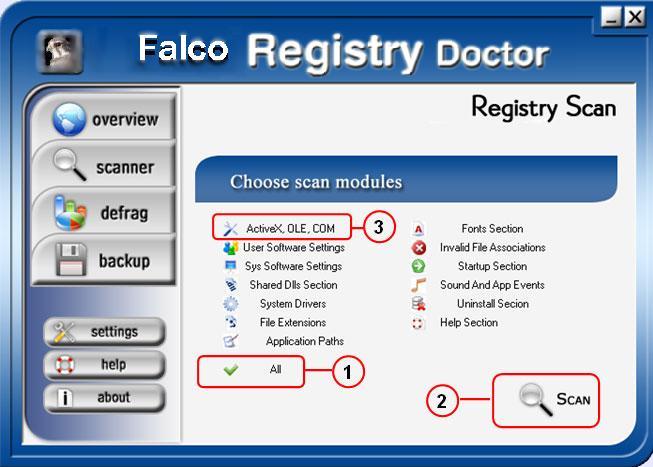 Для выбора желаемого раздела сканирования реестра Вы должны выбрать названия пунктов для сканирования. Например: нажмите на "ActiveX, OLE,COM", чтобы сканировать только информацию о ActiveX,OLE,COM.
