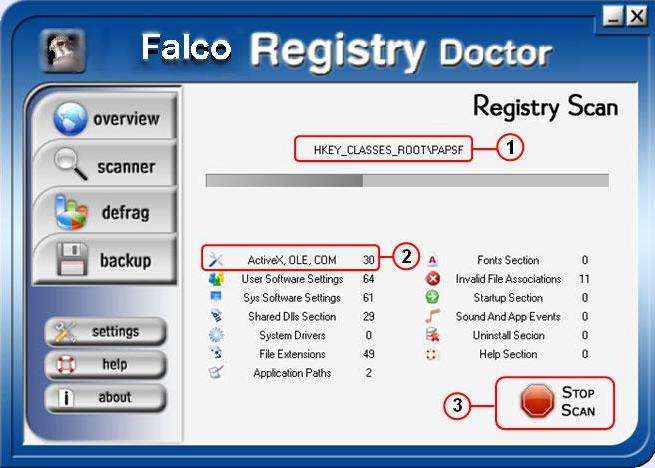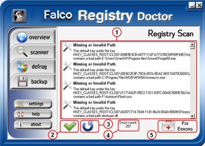 Когда Вы управляете своим просмотром, результаты всплывают автоматически, чтобы показать несоответствия, найденные программой Falco Registry Doctor. Ниже Вы можете видеть пример результатов сканирования: